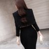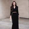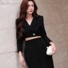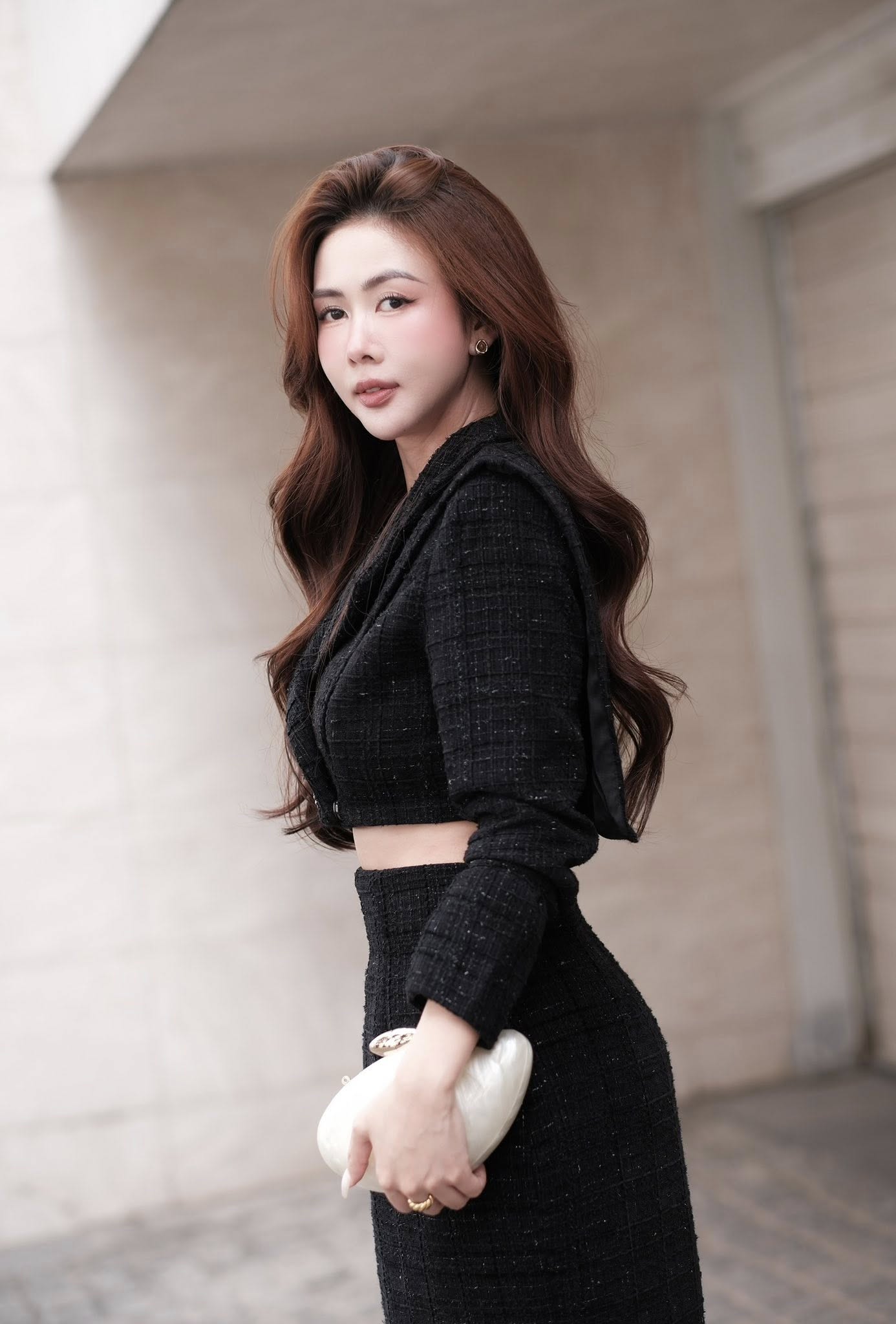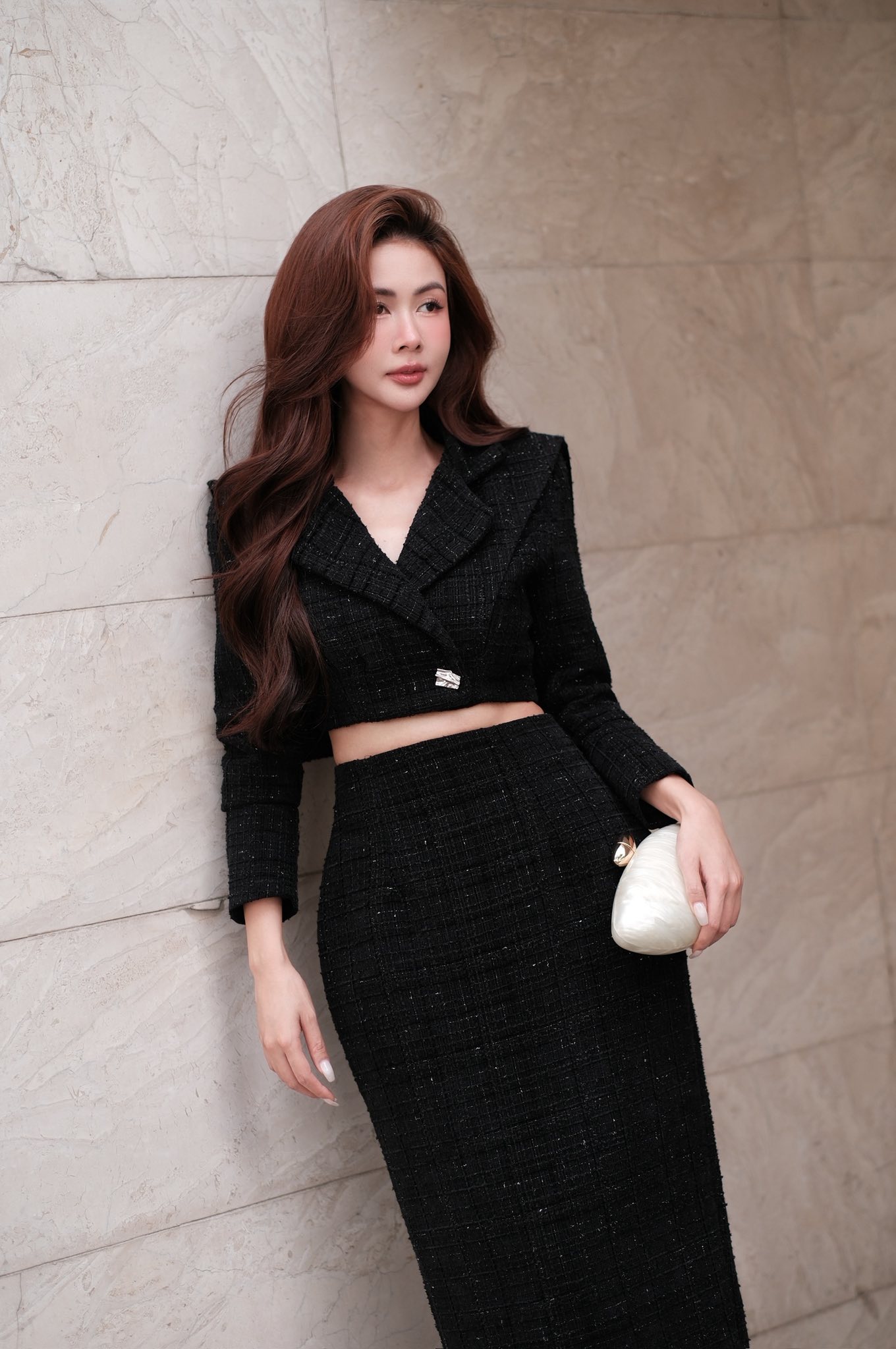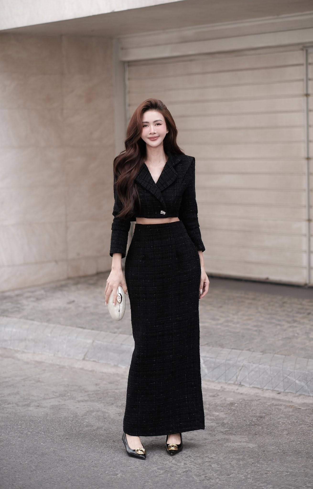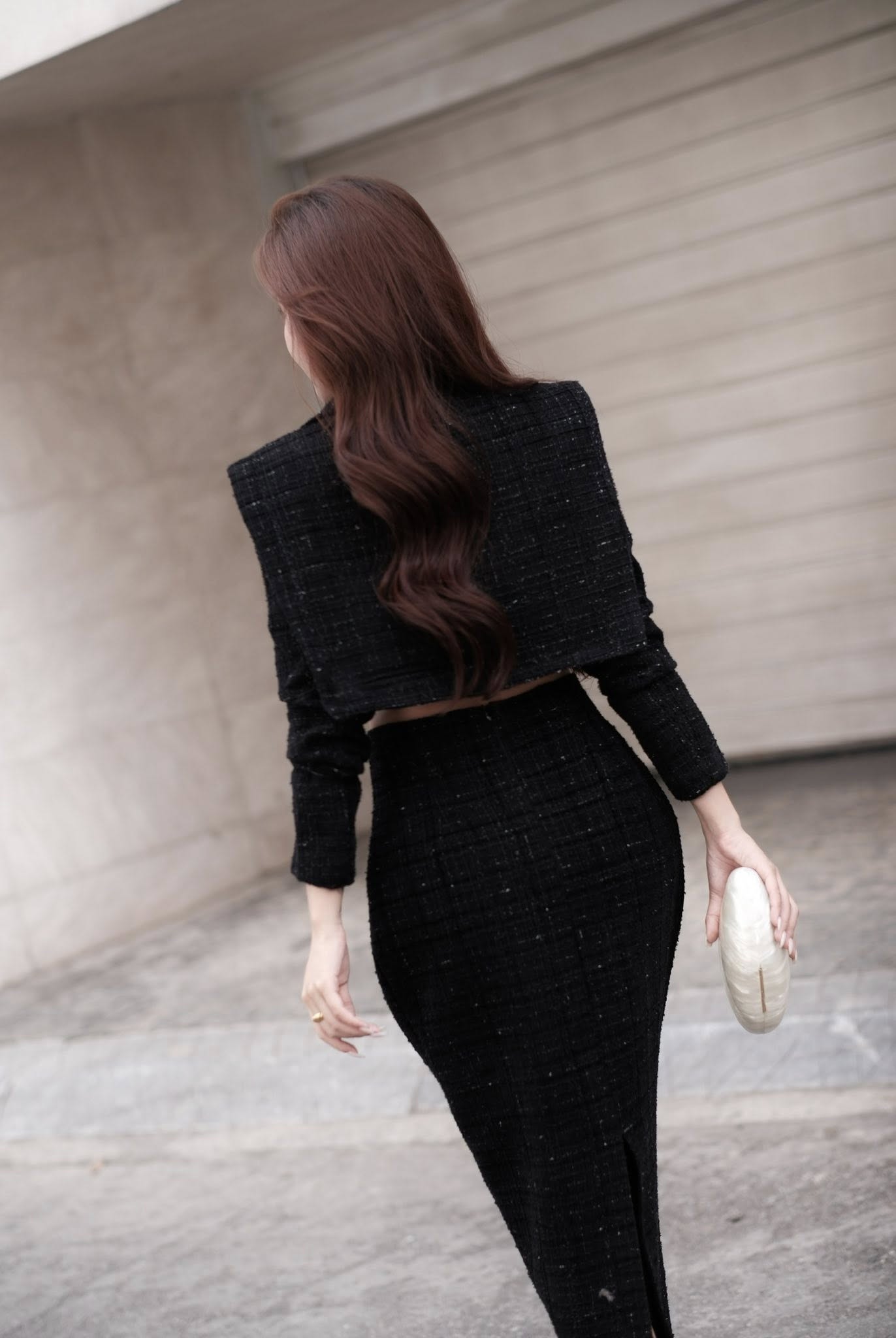 Set áo vest dạ kim sa dáng ngắn và chân váy bút chì