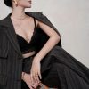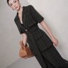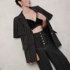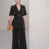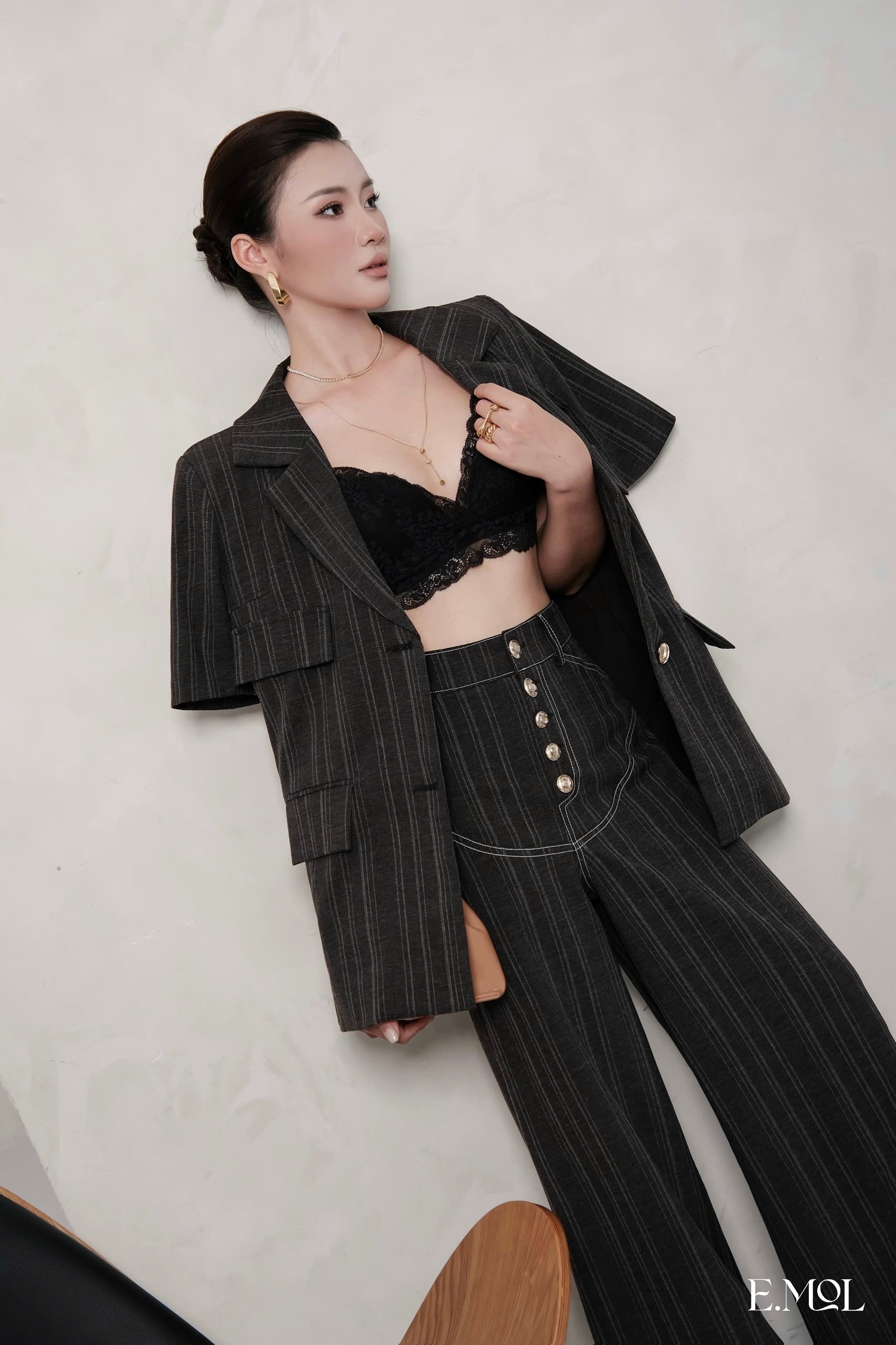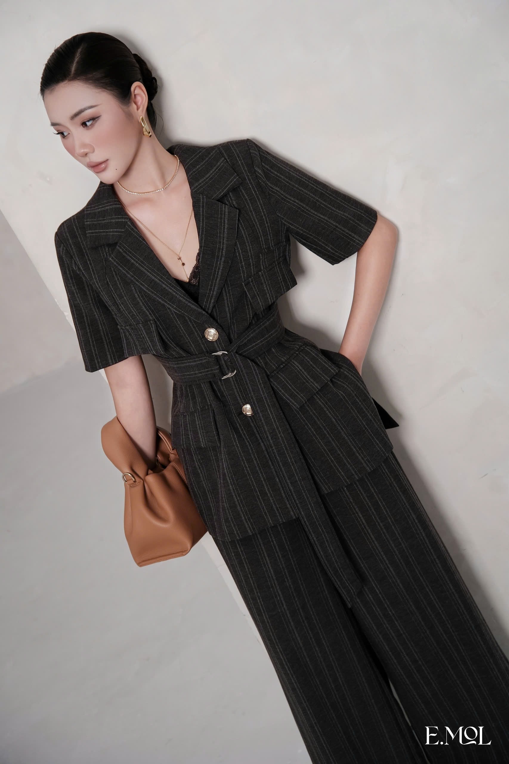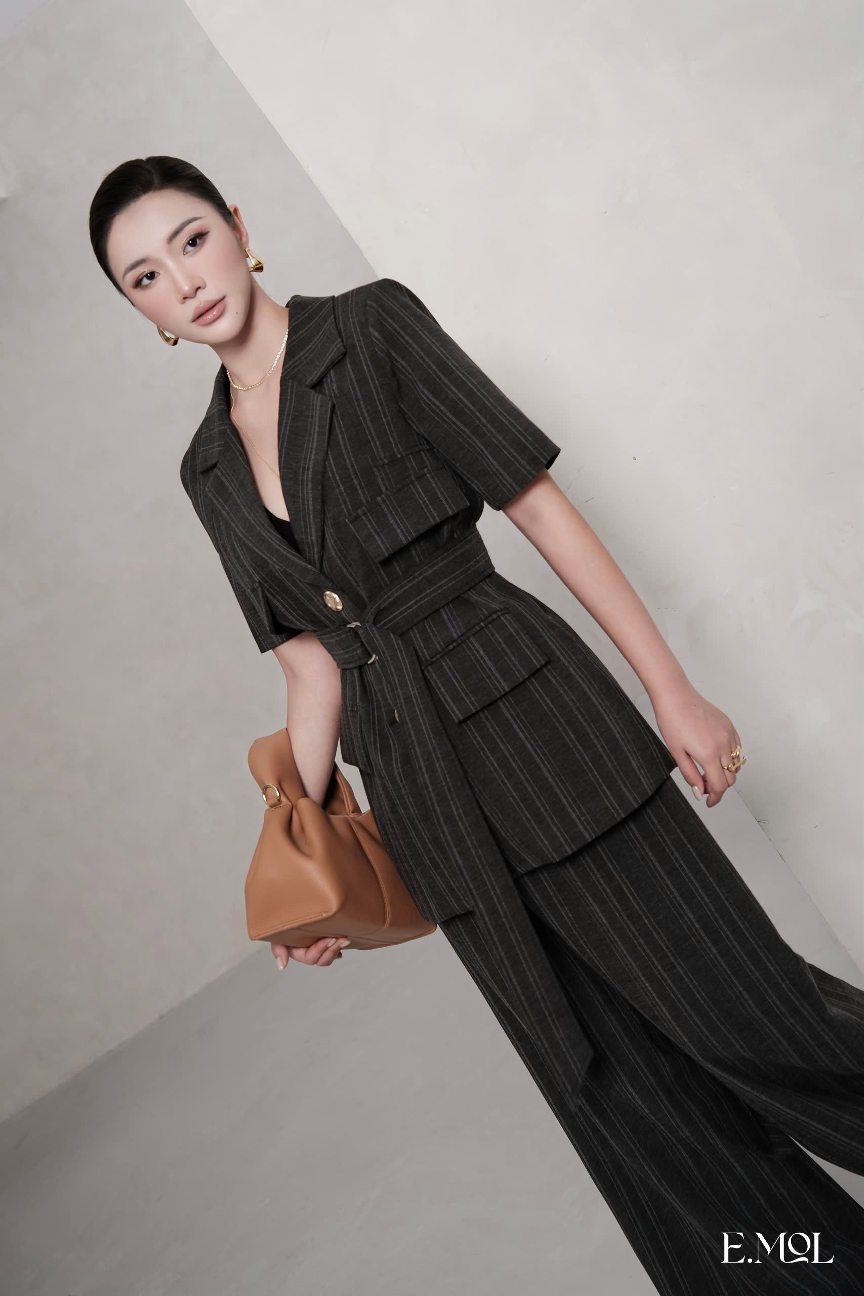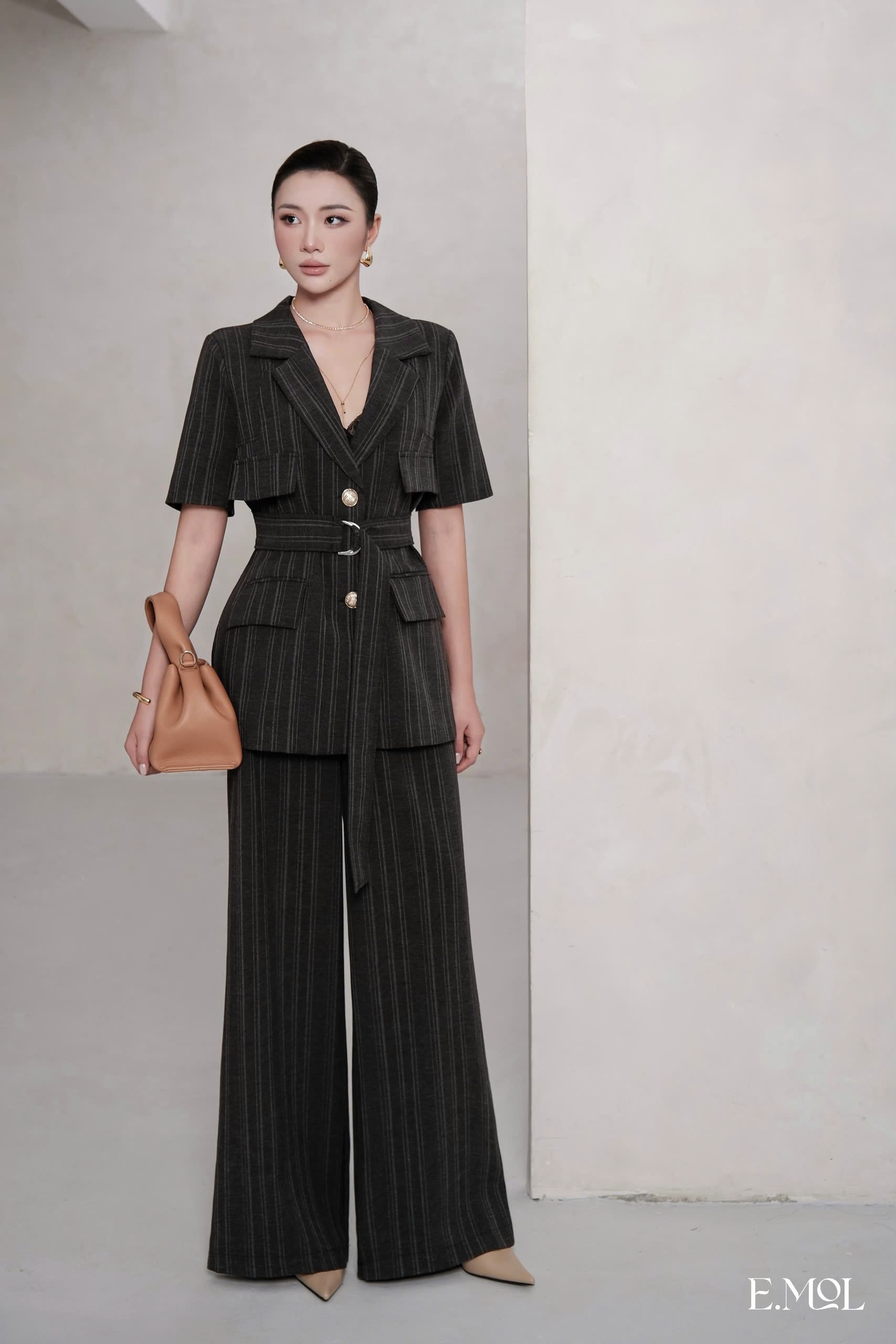 Set kẻ áo vest và quần ống rộng kèm đai eo áo